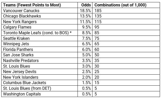 Наилучшими шансами на общий первый выбор (18,5%) обладает "Ванкувер", занявший последнее место в регулярном чемпионате.