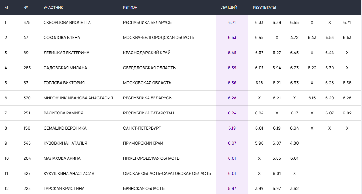 Наша спортсменка показала результат 6,71 м, 2-е место у представительницы Москвы Елены Соколовой с результатом 6,55 м.