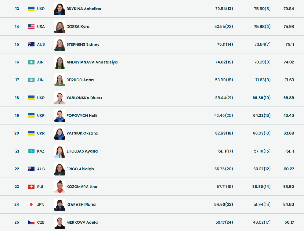Другие представительницы Беларуси в финал не отобрались: Анастасия Андриянова заняла 16-е место, набрав 74,02 балла, Анна Деруго стала 17-й — в ее активе 71,63 балла.
