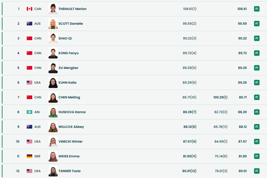 Победительницей в квалификации стала канадская спортсменка Марион Тэну. Её результат 108,61 балла.