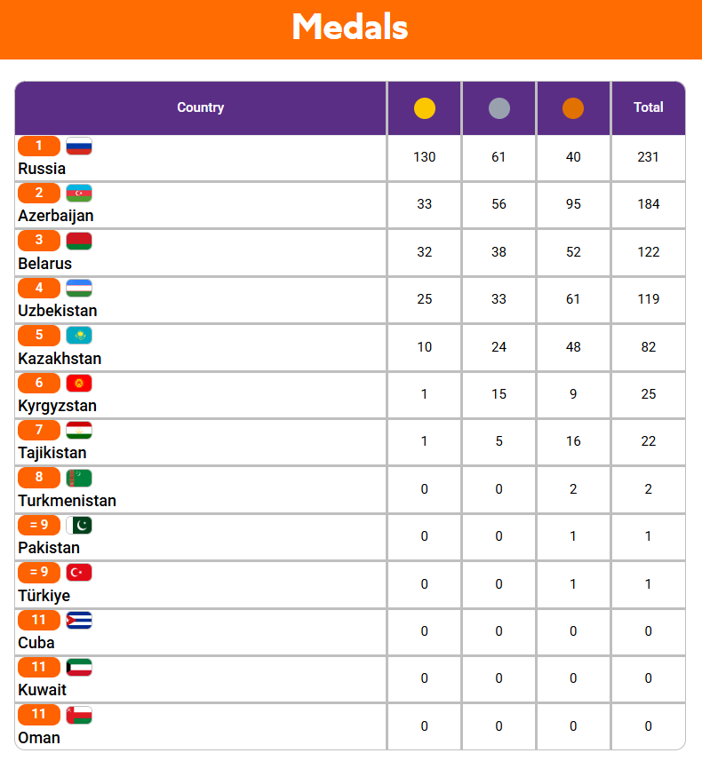 Сборная Беларуси заняла третью строчку в общем медальном зачете среди 13 участвующих стран. Лидерство с большим отрывом удержала Россия — 231 медаль (130-61-40). Второе место досталось хозяевам из Азербайджана с 184 наградами (33-56-95). Призовые места также заняли команды Узбекистана, Казахстана, Кыргызстана, Таджикистана, Туркменистана, Пакистана и Турции. Без наград остались спортсмены из Кубы, Кувейта и Омана.