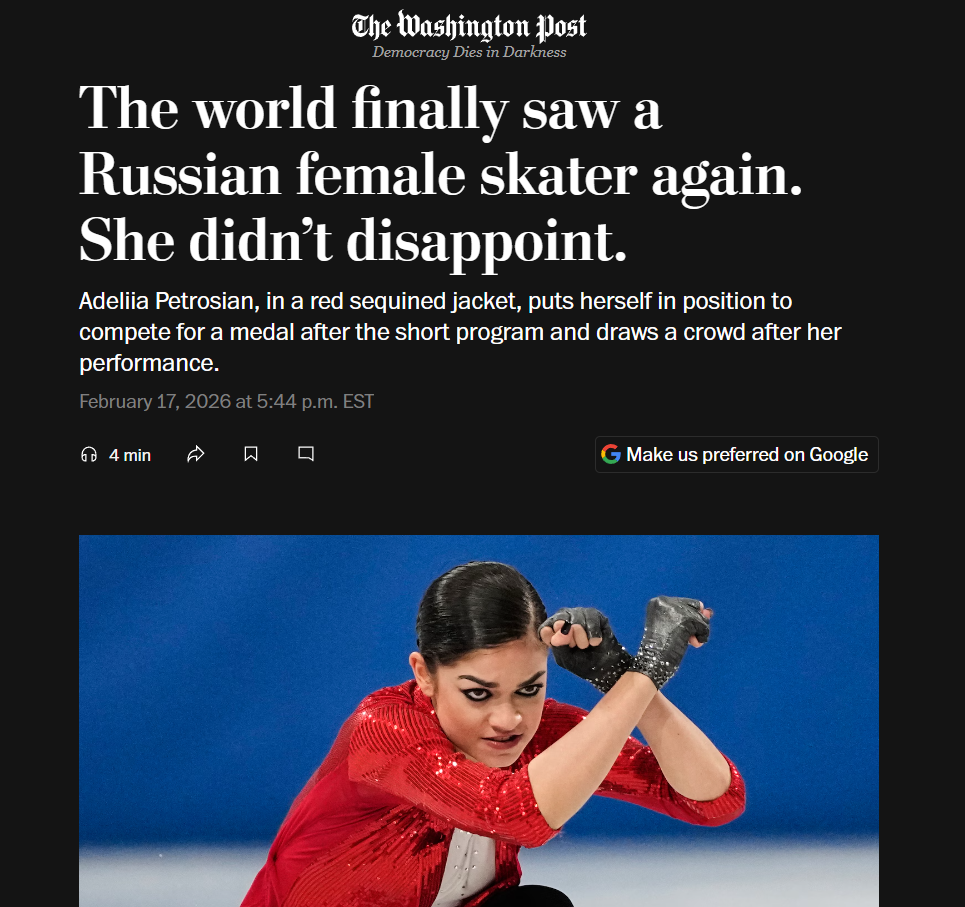 Американское издание Washington Post после завершившейся вчера короткой программы у фигуристок-одиночниц на Олимпийских играх-2026 вышло с заголовком, посвященным российской спортсменке Аделии Петросян.