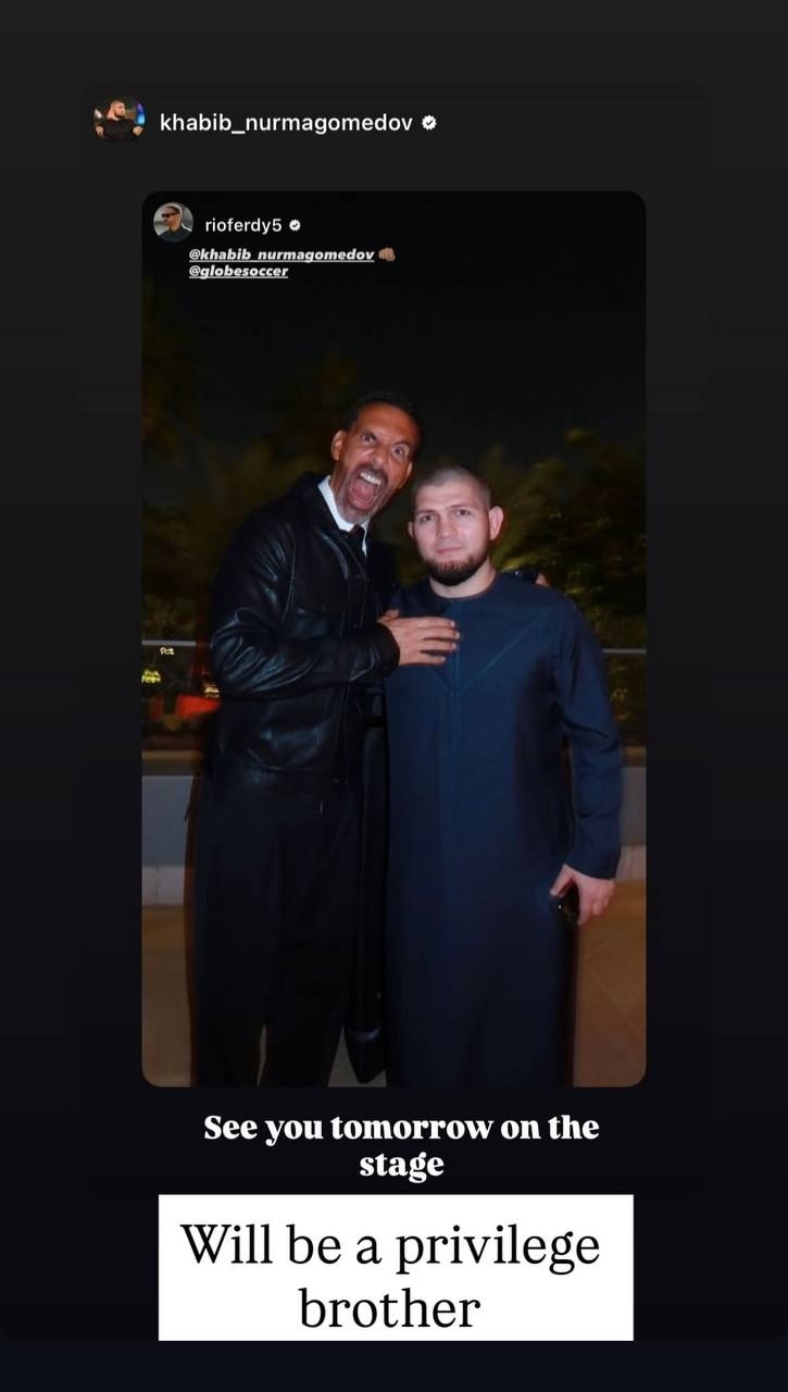 Прославленный английский футболист и телевизионный комментатор Рио Фердинанд разместил новый пост на своей странице в социальных сетях, где показал фото с бывшим чемпионом UFC в лёгком весе россиянином Хабибом Нурмагомедовым.