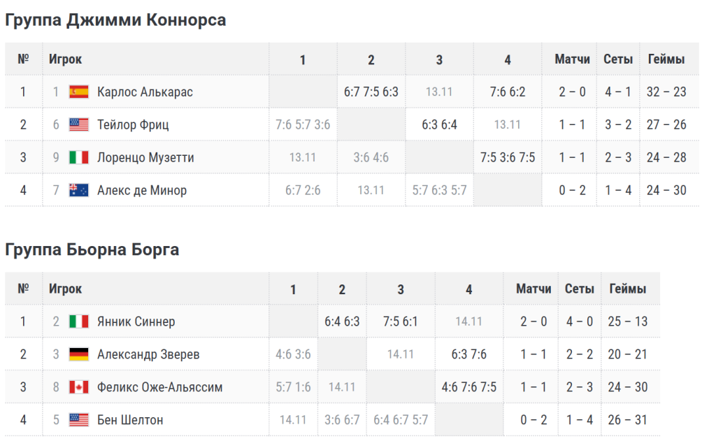 Ещё не обеспечивший себе 100 процентную путёвку в плей-офф первая ракетка мира Карлос Алькарас сыграет с ещё одним претендентом на выход в полуфинал Лоренцо Музетти. Ещё один претендент Тейлор Фриц сыграет с потерявшим все шансы Алексом де Минором.