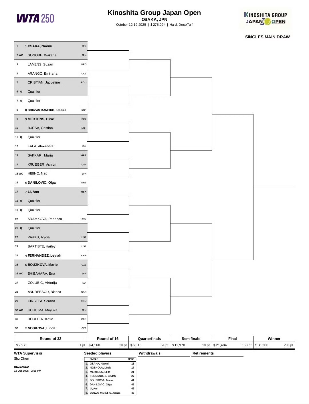 Стала известна сетка турнира категории WTA-250 в Осаке.