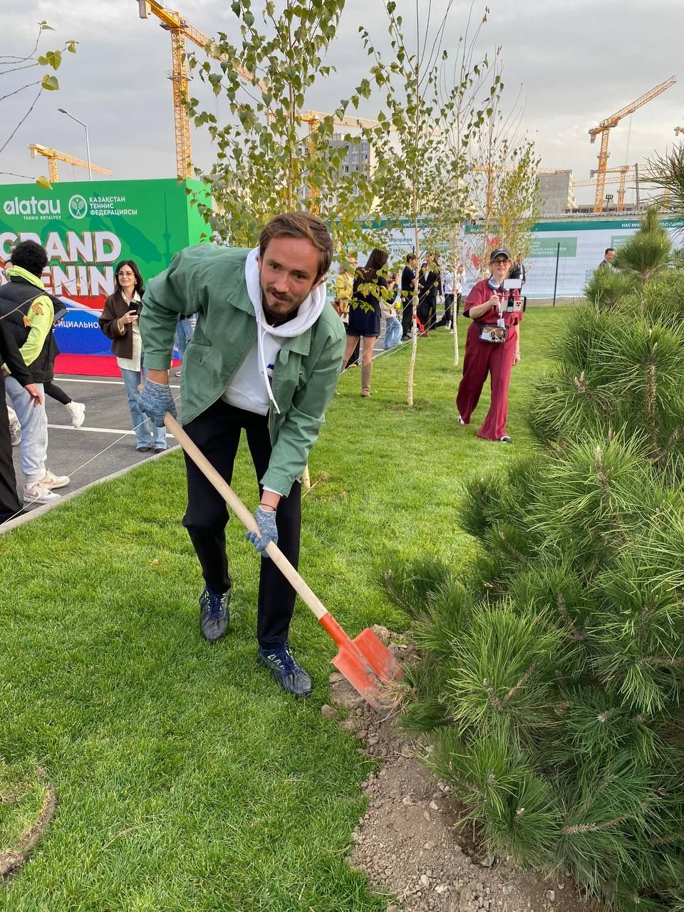 Российские теннисисты Даниил Медведев (14) и Карен Хачанов (10) приняли участие в посадке деревьев на открытии теннисного центра в Алма-Ате.