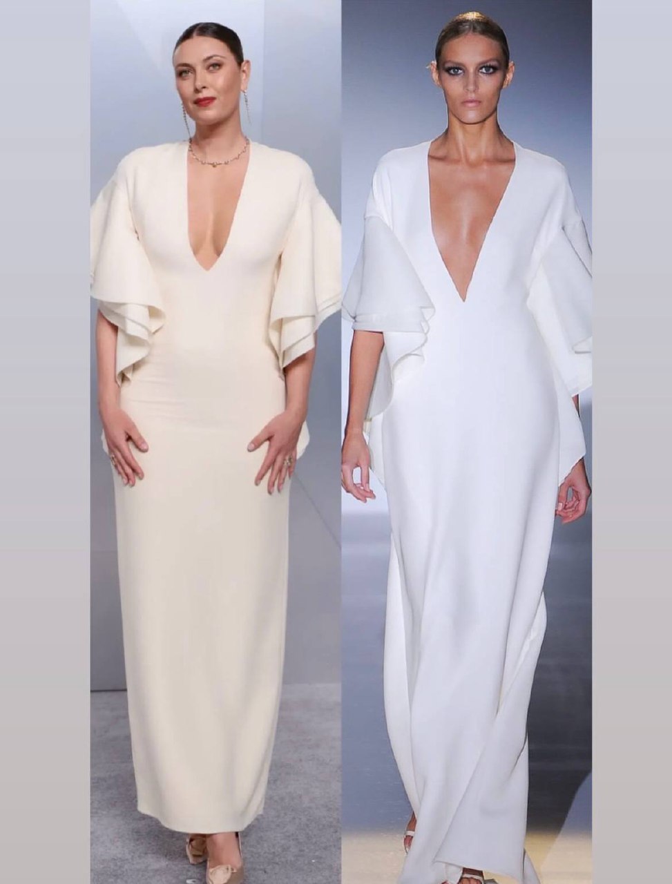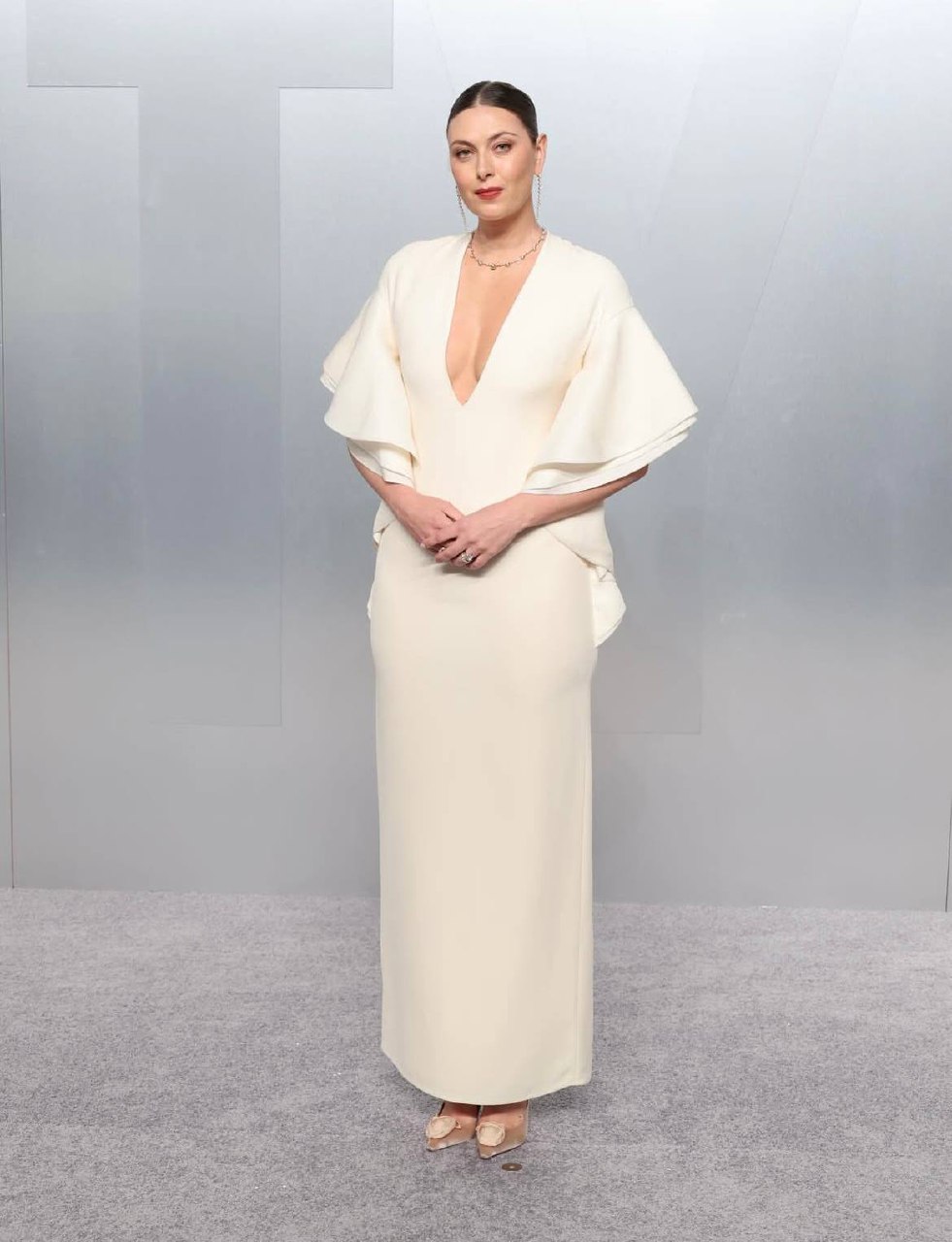 Образ Шараповой состоял из платья молочного цвета с глубоким декольте, но акцент был не на этом. Самой яркой деталью являлись ярко-красные губы.
