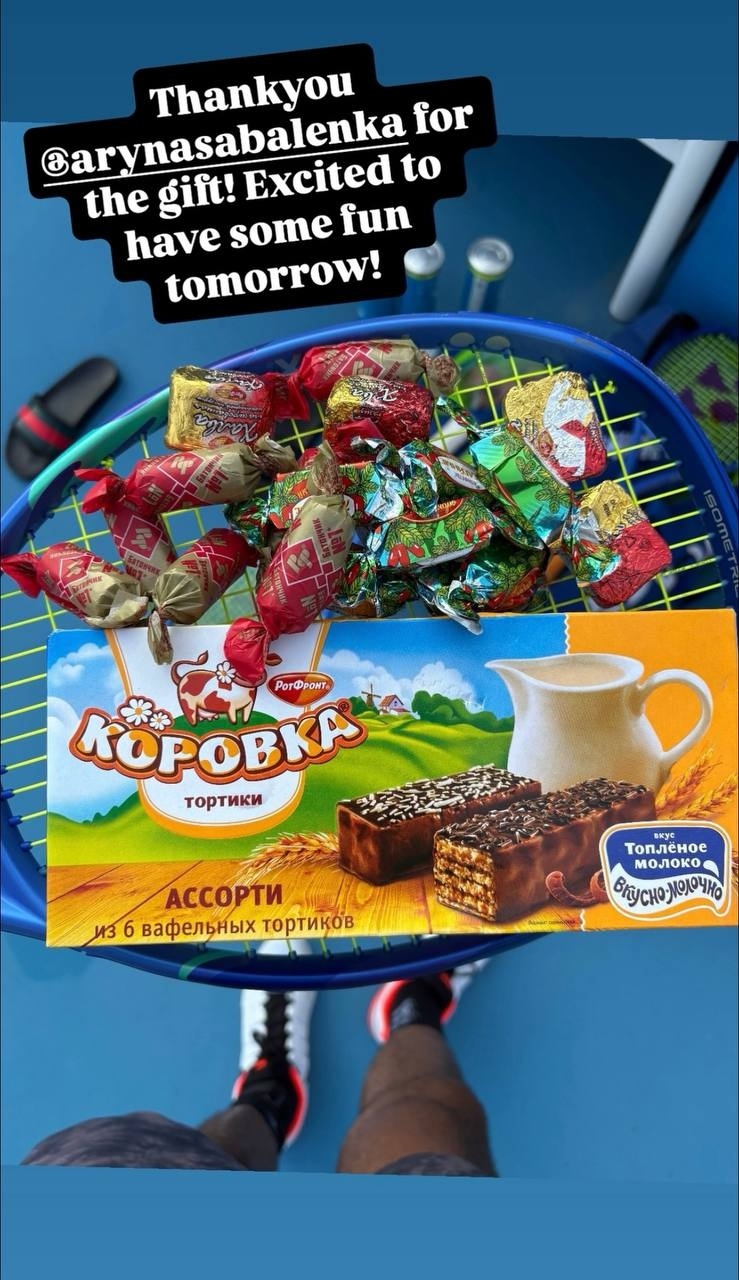 Первая ракетка мира вручила теннисисту конфеты от российского производителя "РотФронт": вафельные тортики, Батончик №1, Халву, а также Желейные конфеты со вкусом барбариса от кондитерской фабрики "Красный октябрь".