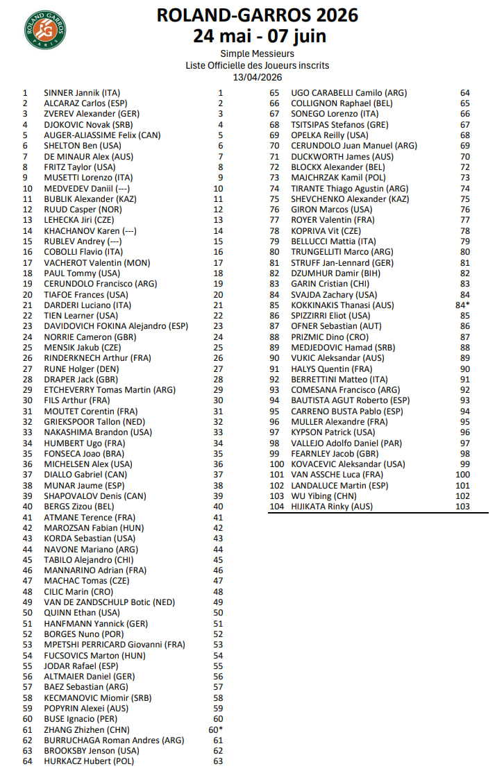 Организаторы "Ролан Гаррос-2026" опубликовали список участников мужского турнира.