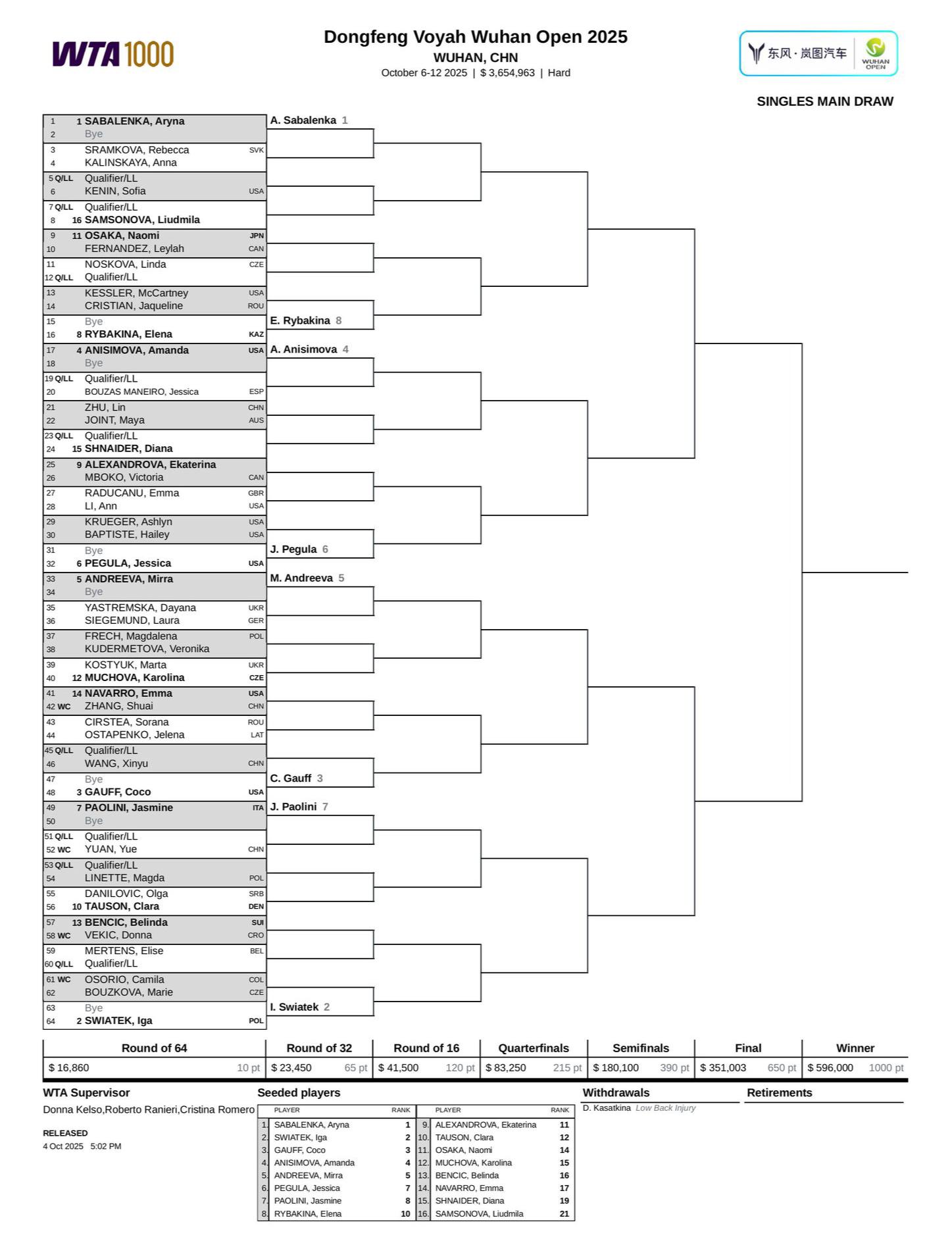 Четыре лучших теннисистки рейтинга WTA — Соболенко, Швёнтек, Гауфф и Анисимова — возглавили посев в своих четвертях, за ними следуют остальные из первой десятки. Наверняка каждая из них расчитывает квалифицироваться в Эр-Рияд по итогам тысячника.