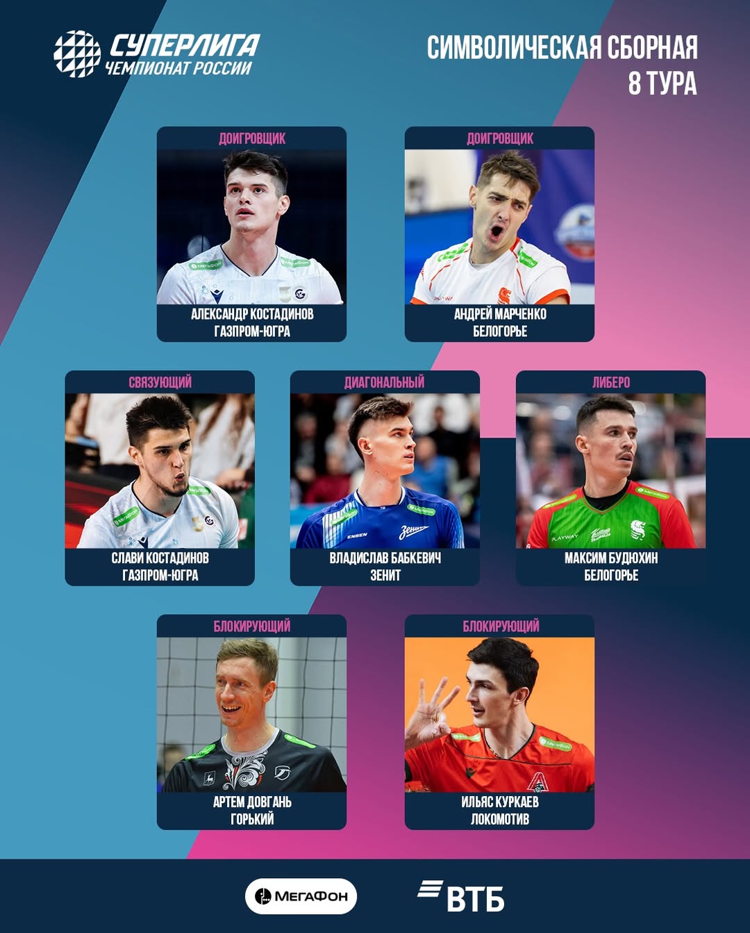 Экспертный совет Всероссийской федерации волейбола выбрал символическую сборную восьмого тура российской волейбольной Суперлиги (мужчины).